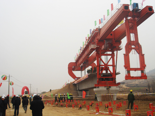 以及生產(chǎn)更新運架產(chǎn)品能架設(shè)跨度40M高速鐵路箱梁的:SXJ1000T/40M一跨式架橋機(配套攀爬式運梁車可以實現(xiàn)過隧道零距離架梁)和攀爬式運梁車。并能對現(xiàn)有32M分體式運架設(shè)備進行改造,改造后能實現(xiàn)高低位架設(shè)跨度40M高速鐵路箱梁(高位改造不能過隧道,把原架橋機改造一跨式,把原運梁車增加2軸。低位改造能過隧道架梁,把原架橋機改造一跨式低位,把原運梁車改成攀爬式運梁車并增加二臺喂梁臺車實現(xiàn)過隧道架梁)。